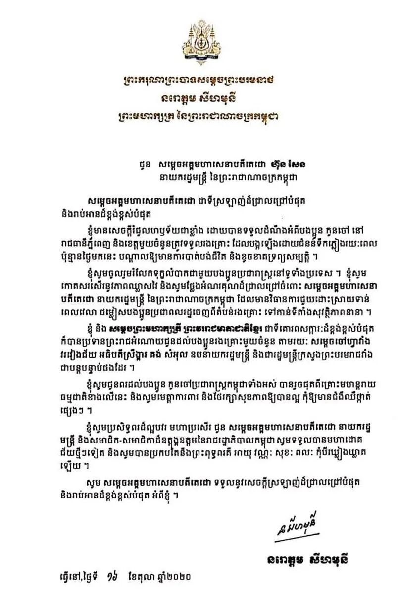 诺罗敦·西哈莫尼国王于16日致函洪森总理,高度评价以洪森总理为领导的执政政府积极开展救灾工作,紧急疏散受灾居民至安全地区。