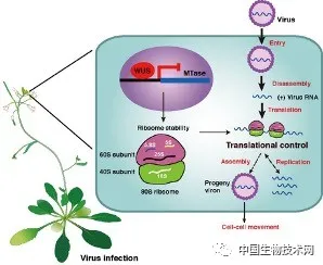 为了解析WUS介导的干细胞免疫病毒的分子机制,研究人员通过转录组学分析,鉴定了一类受WUS蛋白直接调控的下游基因:SAM甲基转移酶(S-adenosyl-L-methionine-dependent methyltransferases, MTases)。生化实验证明该甲基转移酶参与了25S核糖体RNA(25S rRNAs)的m5C甲基化。WUS直接抑制MTases基因的表达,影响了核糖体RNA的加工和核糖体的稳态,进而可以抑制病毒蛋白质的合成。 为了研究WUS介导的干细胞抗病毒免疫是否具有广谱性,该研究还检测了其他三种植物病毒:芜菁皱缩病毒(Turnip crinkle virus, TCV)、烟草脆裂病毒(tobacco rattle virus, TRV)和芜菁花叶病毒(turnip mosaic virus, TuMV),得到了一致的结论,说明WUS介导的抗病毒免疫可以针对多种植物病毒的侵染。由于WUS及其同源基因在植物中广泛存在,具有高度的功能保守性。这就进一步解释了为什么茎尖脱毒可以应用于多种不同种属的植物,并且能够清除感染这些植物的多种多样的病毒。 总之,该研究揭示了植物茎顶端分生组织存在广谱抗病毒免疫的分子机制。在侵染过程中,病毒必须利用植物细胞内的蛋白质合成系统合成自身的蛋白,以完成自身的复制、组装和侵染过程。而干细胞关键调节基因WUS则通过直接抑制细胞内蛋白质合成的速率,限制了病毒的复制和传播(图2)。该研究不仅回答了为什么植物病毒不能侵染植物分生组织这一长而未决的生物学问题,同时也为未来作物抗病毒防治提供了新的技术策略。
