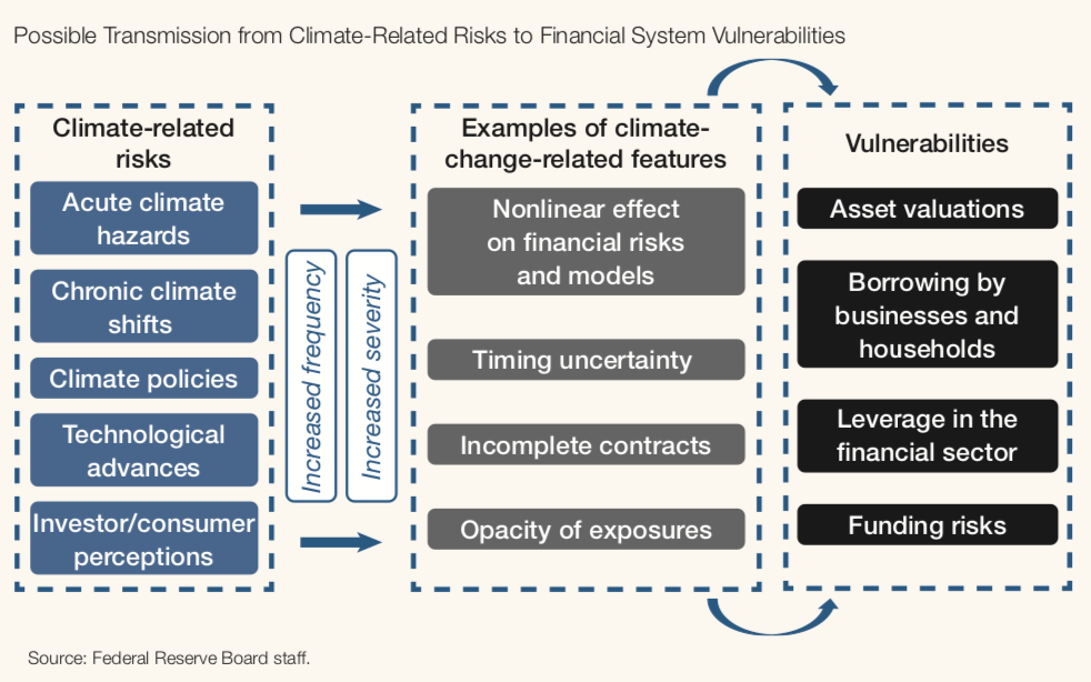美联储的报告指出,气候变化对金融稳定的影响气候变化是指全球平均气温上升的趋势,以及随之而来的环境变化,如海平面上升和更严重的天气事件。气候变化增加了经济不确定性和风险,美国联储局刚刚开始将这些因素纳入对金融稳定的分析中。不同的经济部门和地理区域面临着不同的风险,这些风险将不同于历史模式。美国联储局将重点放在气候变化如何增加经济混乱和混乱的可能性,如何加剧金融冲击和金融系统脆弱性,从而进一步放大这些冲击。诸如风暴、洪水、干旱或野火等严重的灾害可以迅速改变或揭示有关未来经济状况或实物或金融资产价值的新信息。此外,在公众对风险看法迅速转变的情况下,长期危害(如海平面缓慢上升)有可能产生类似的突然重新估值。这些与气候灾害相关的重新估值事件和直接损失可能导致金融冲击的频率和严重性增加;这些冲击的时间和影响很难预先预测。
